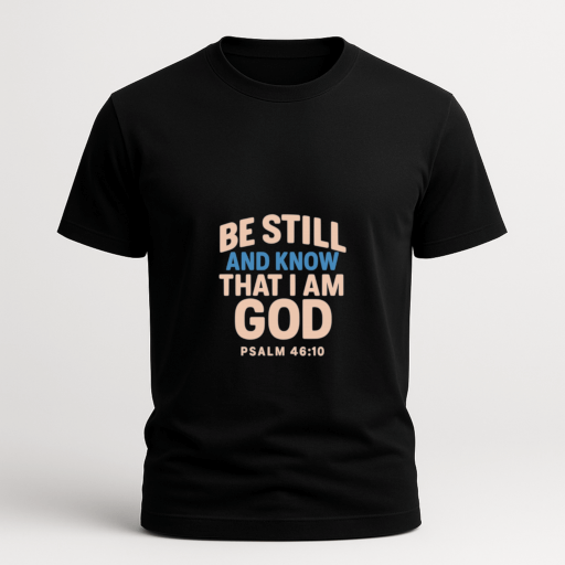 A calm and meaningful faith-inspired t-shirt featuring the verse “Be still and know that I am God” from Psalm 46:10.